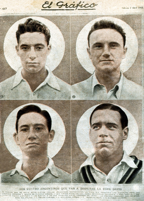 Carlos Caminos, Guillermo Robson, Ronald Boyd y Alfredo Villegas en la portada de la revista El Gráfico de 1923, antes de jugar el primer match de Copa Davis para nuestro país.
